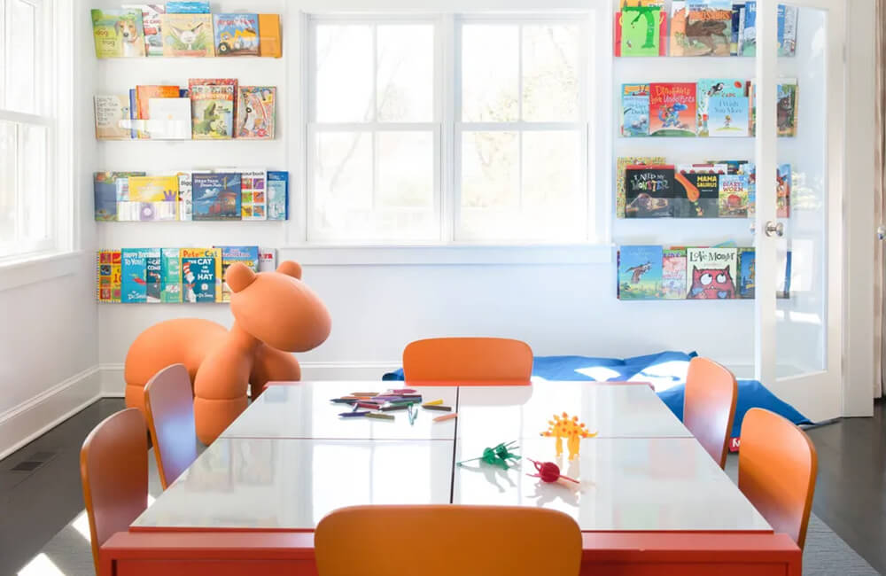 Reading Nook: A cozy corner with age-appropriate books, soft cushions, and good lighting encourages reading and enhances language skills.